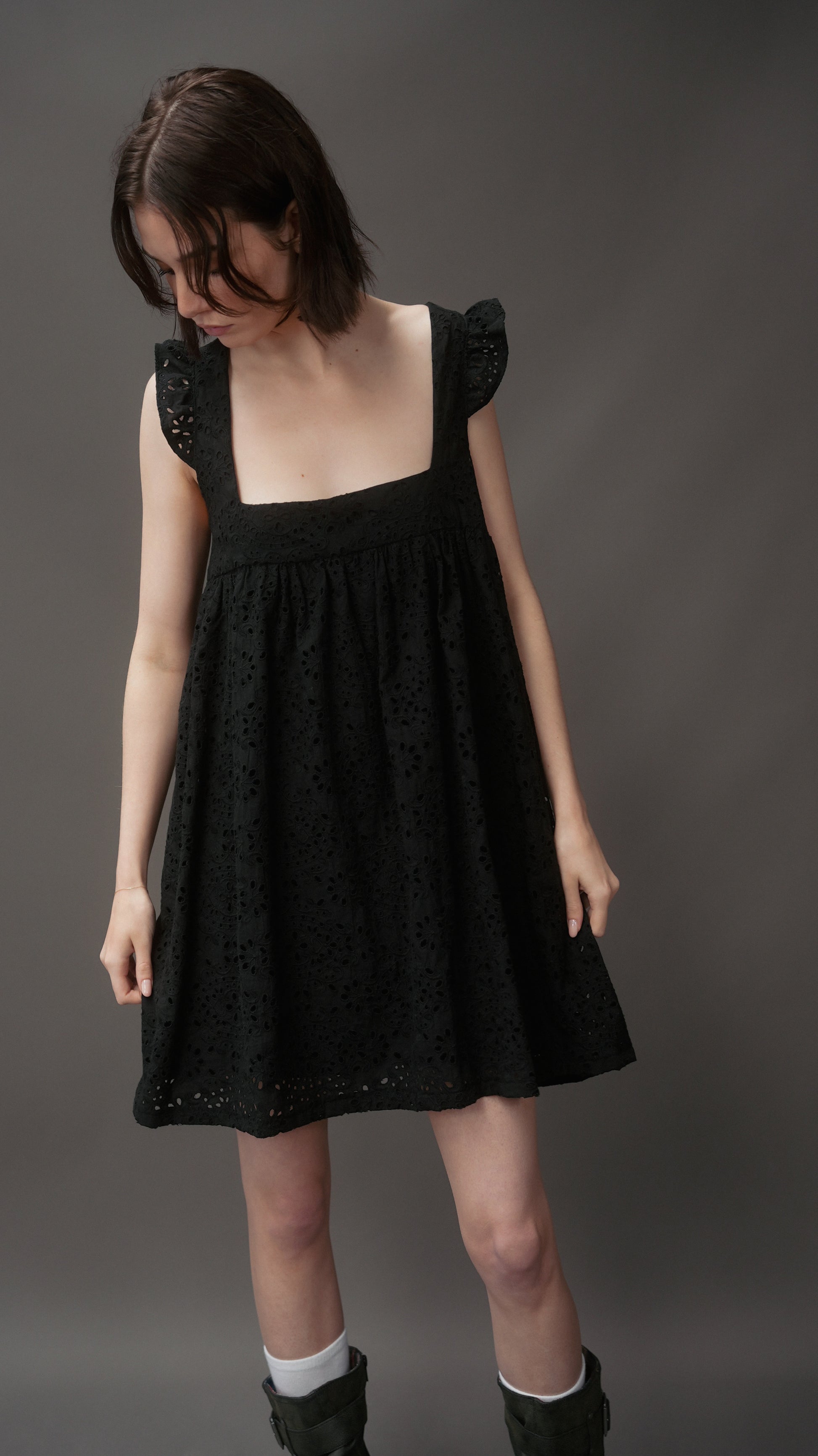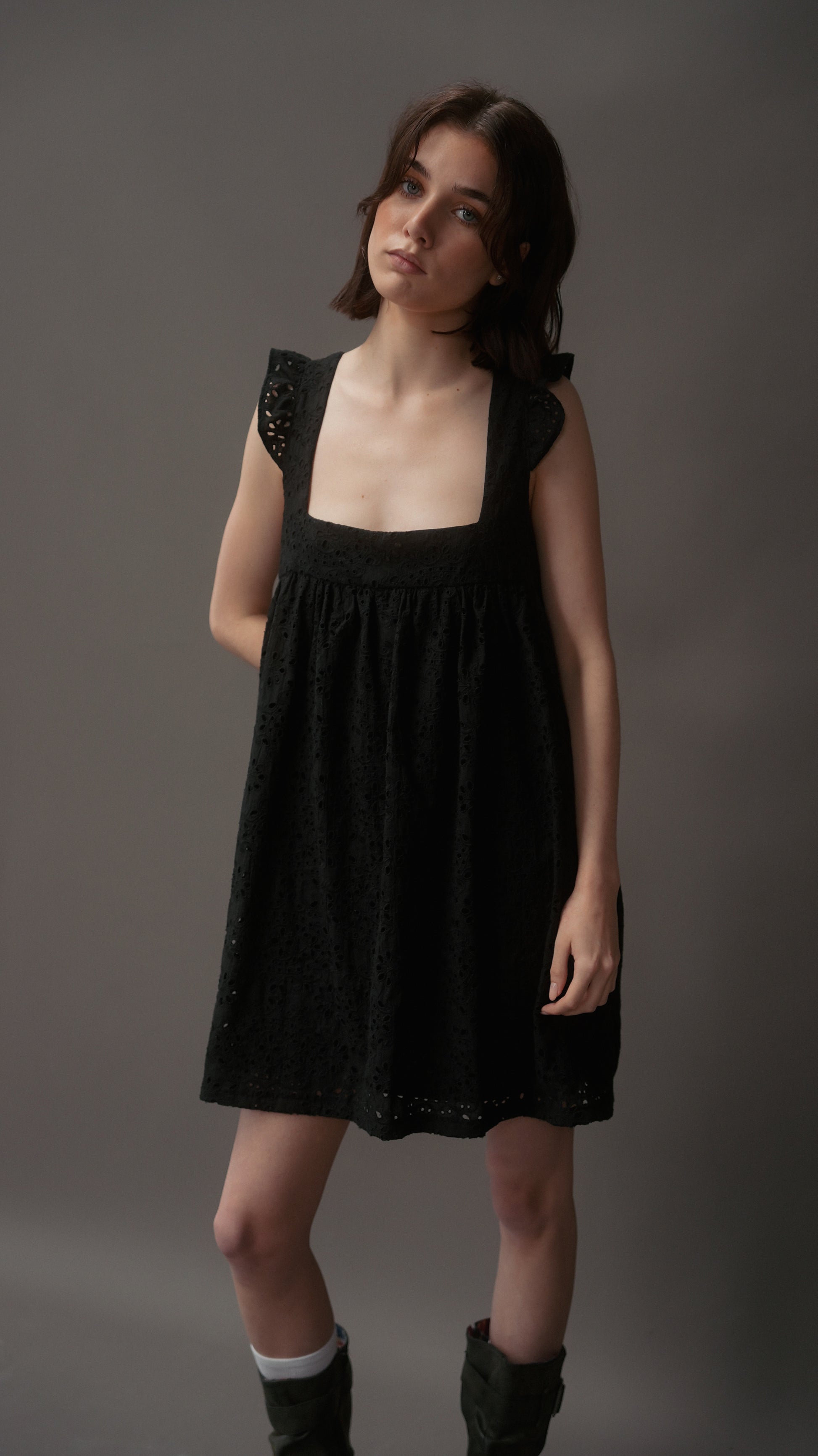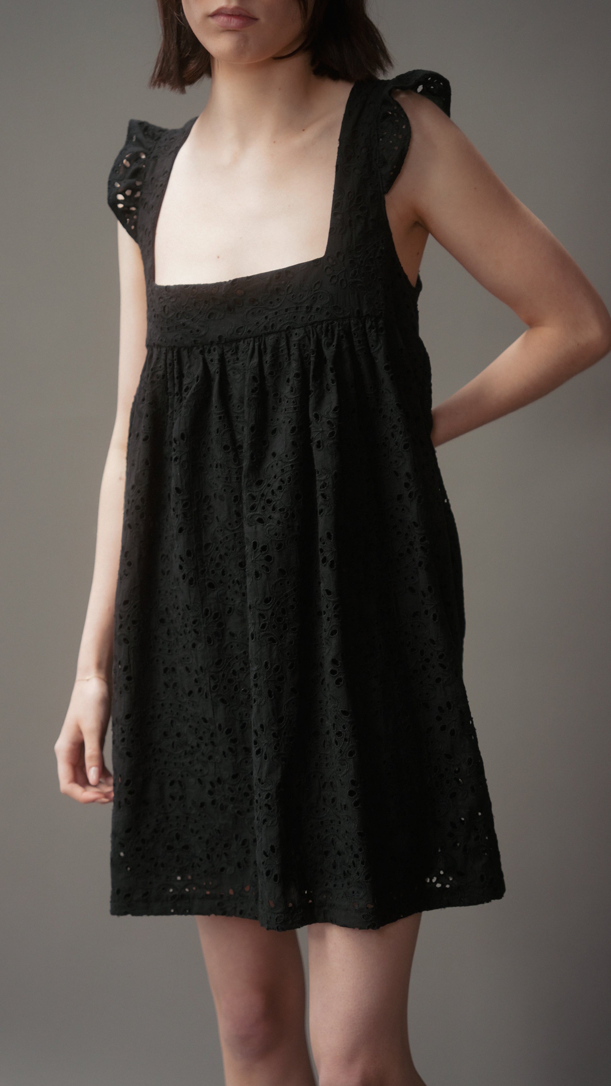 A darling broderie mini dress with a square neckline, flutter sleeves, and a relaxed babydoll fit. The Chateau Dress is lightweight, easy to wear, and perfect for everyday styling.