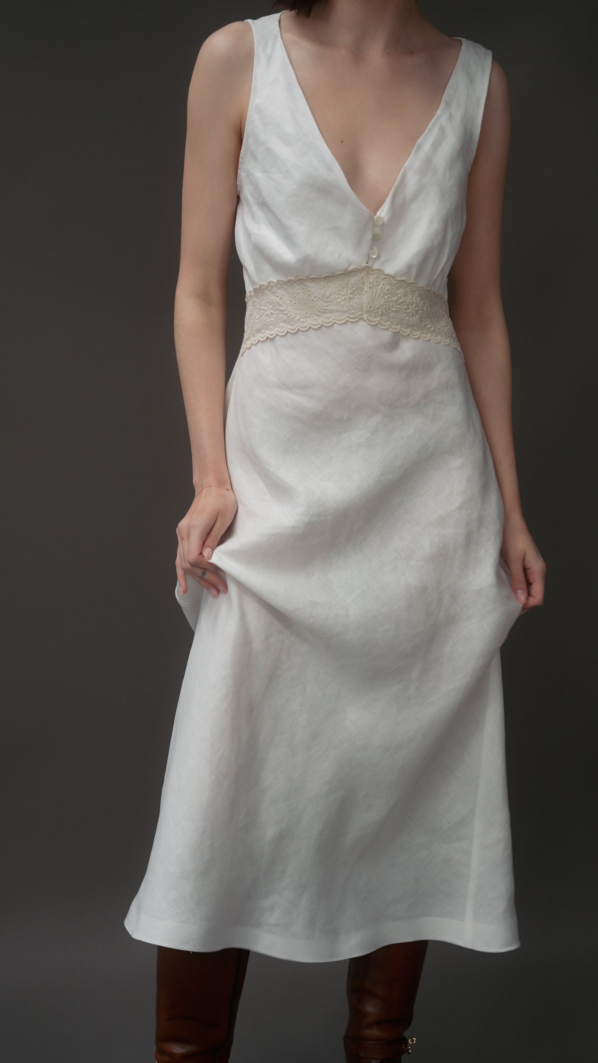 A white hemp sleeveless midi dress with a deep V-neckline, delicate button detail, and statement embroidery detail. The Jardin Dress is bias cut for an effortlessly feminine silhouette.
